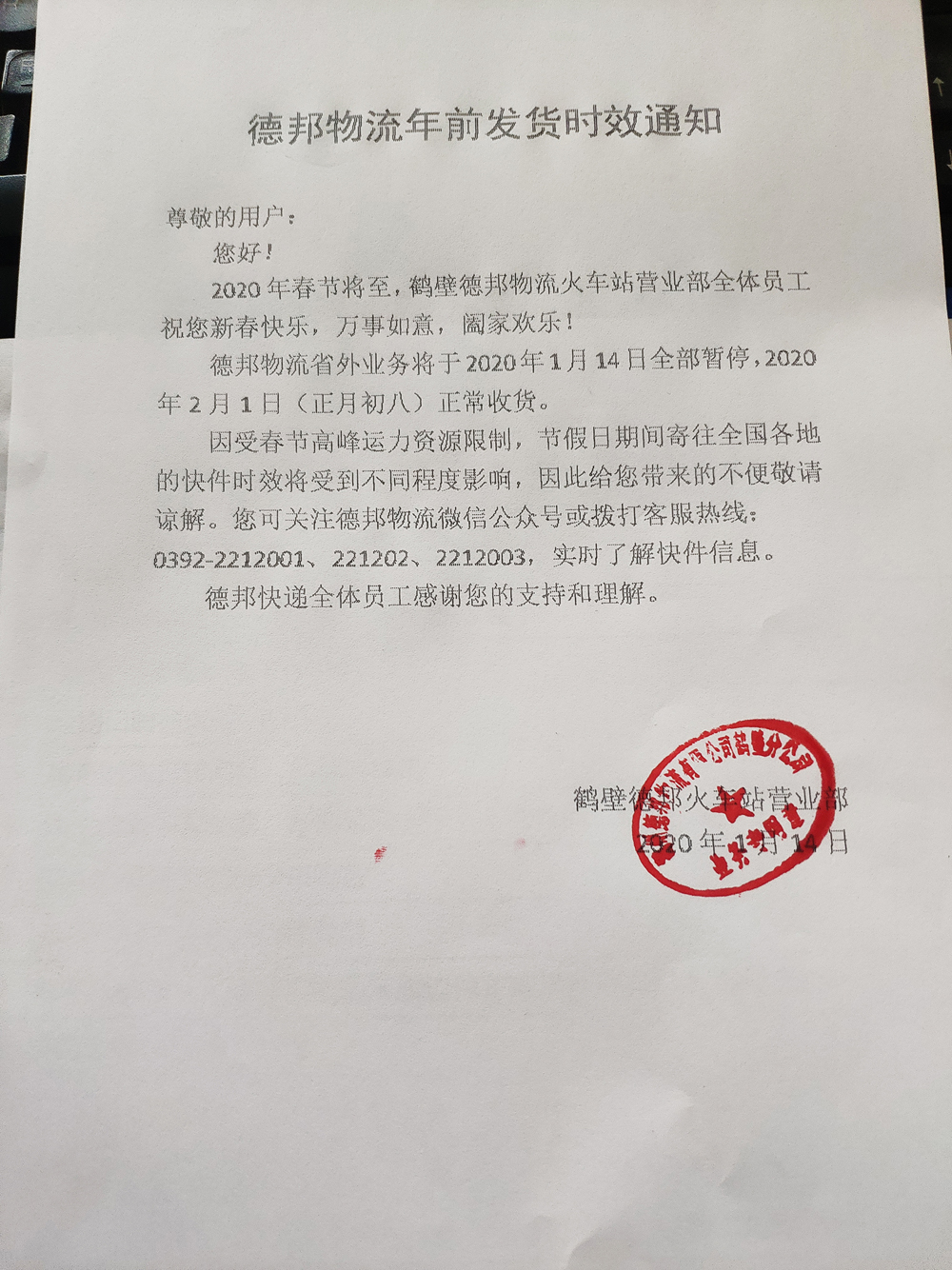 以上物流停止接貨當(dāng)日及當(dāng)日以后發(fā)出的貨物,我司不能保證正常的運(yùn)輸?shù)截洉r(shí)效。