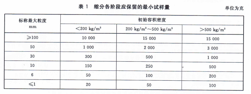 4.1樣品縮分后的最小試樣量:表1給出了每一縮分階段應(yīng)保留的最小樣品質(zhì)量,它主要取決于物料的標(biāo)稱最大粒度和容積密度。標(biāo)稱最大粒度可通過篩分試驗(yàn)確定,容積密度的測定方法見附錄C,部分物料的初始容積密度參見附錄D。除了表1中說明的最小質(zhì)量之外,還應(yīng)保證縮分后的樣品量能滿足實(shí)際試驗(yàn)的需要。